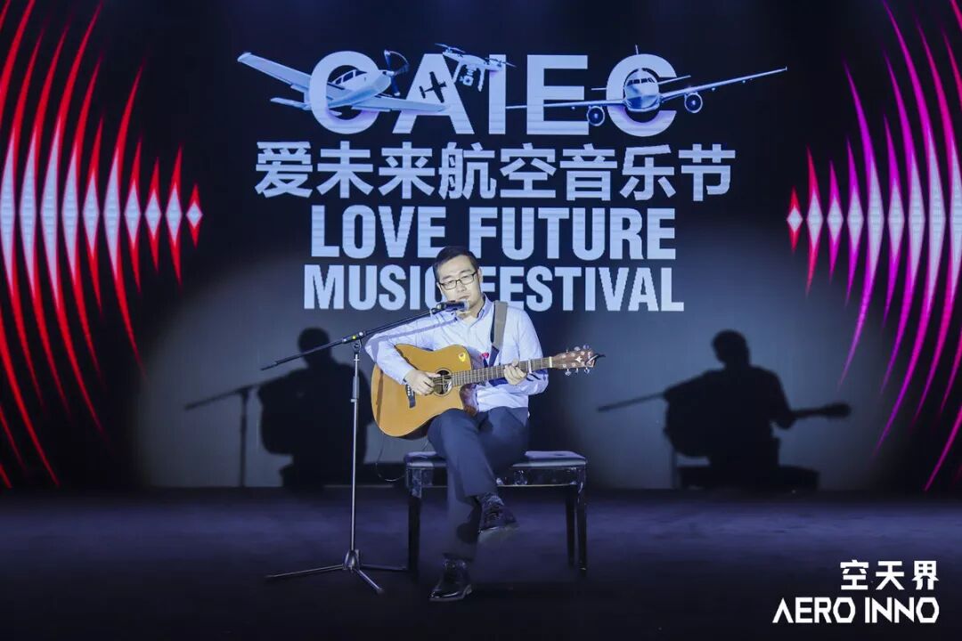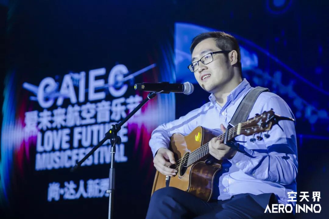 大赛创业组参赛项目,来自上海航数智能科技有限公司的航空发动机健康管理系统的路演人韩飞,在音乐节献上吉他独唱《忽然之间》,颇具专业舞台范儿。