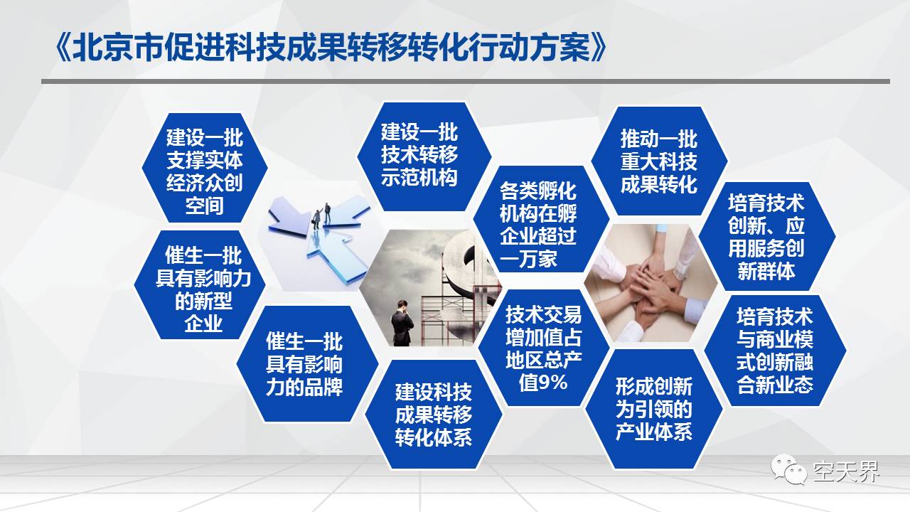 《北京市促进科技成果转移转化的行动方案》要建设一批支撑实体经济的众创空间,建设一批技术转移的示范机构,要求各类孵化机构在孵企业的数量超过1万家,推动一批重大科技成果转化,培育技术创新、应用服务创新群体,培育技术与商业模式创新融合的新业态,形成创新为引领的产业体系,技术交易增加值占地区总产值的9%,建设科技成果转移转化体系,催生一批具有影响力的品牌,催生一批具有影响力的创新型企业。