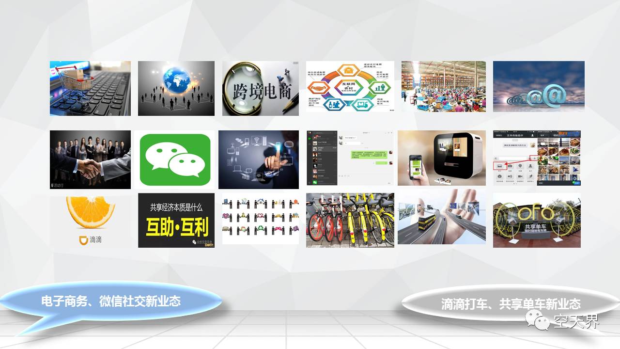 这一张列出的图标大家都比较熟悉,这些图标是基于互联网技术和移动终端发展起来的电子商务和微信社交平台。电子商务和微信平台极大的改变了大众的生活模式,颠覆了传统的商业模式,带动了第三方支付、物流、快递、电子金融行业的快速发展。