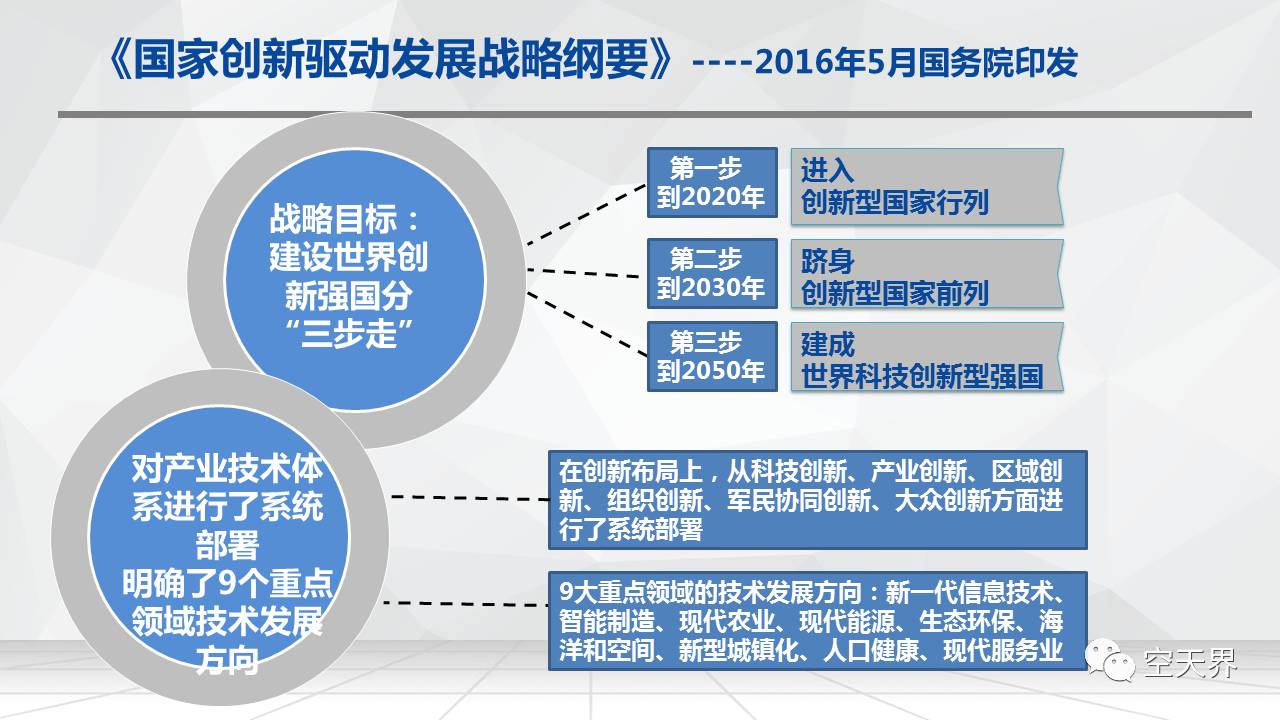 首先介绍《国家创新驱动发展战略纲要》,2016年5月国务院办公厅印发的指导性文件,在战略目标上提出了建设世界创新强国分为三步走: