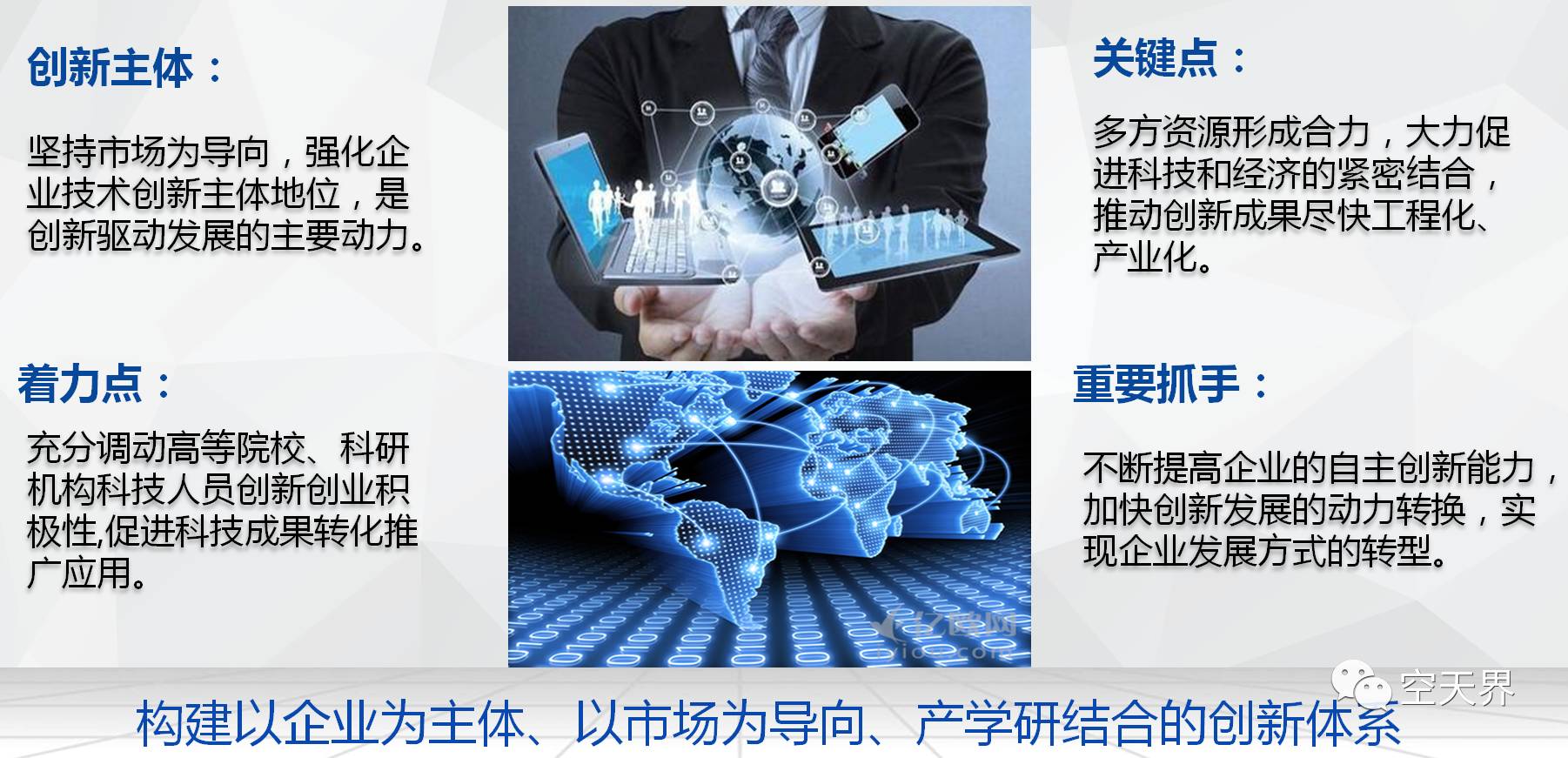 着力点应该充分调动高校、科研机构、科技人员创新创业的积极性,要激活源头的创新资源,要促进科技成果转化的推广应用。重要抓手是不断提高企业自主创新能力,加快创新发展的动力转换,实现企业发展方式的转变。