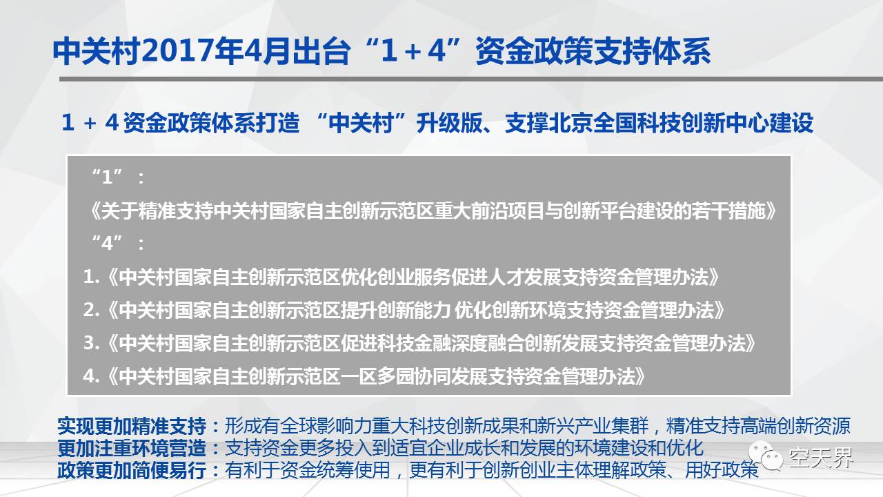 我们今天花比较多的时间介绍中关村在今年4月份出台的“1+4”资金政策的支持体系。中关村示范区今年2017年4月份出台的“1+4”资金政策的支持体系是梳理和整合了中关村地区历年以来若干丰富的多层次的资金支持整合在一起,打造了中关村的升级版。