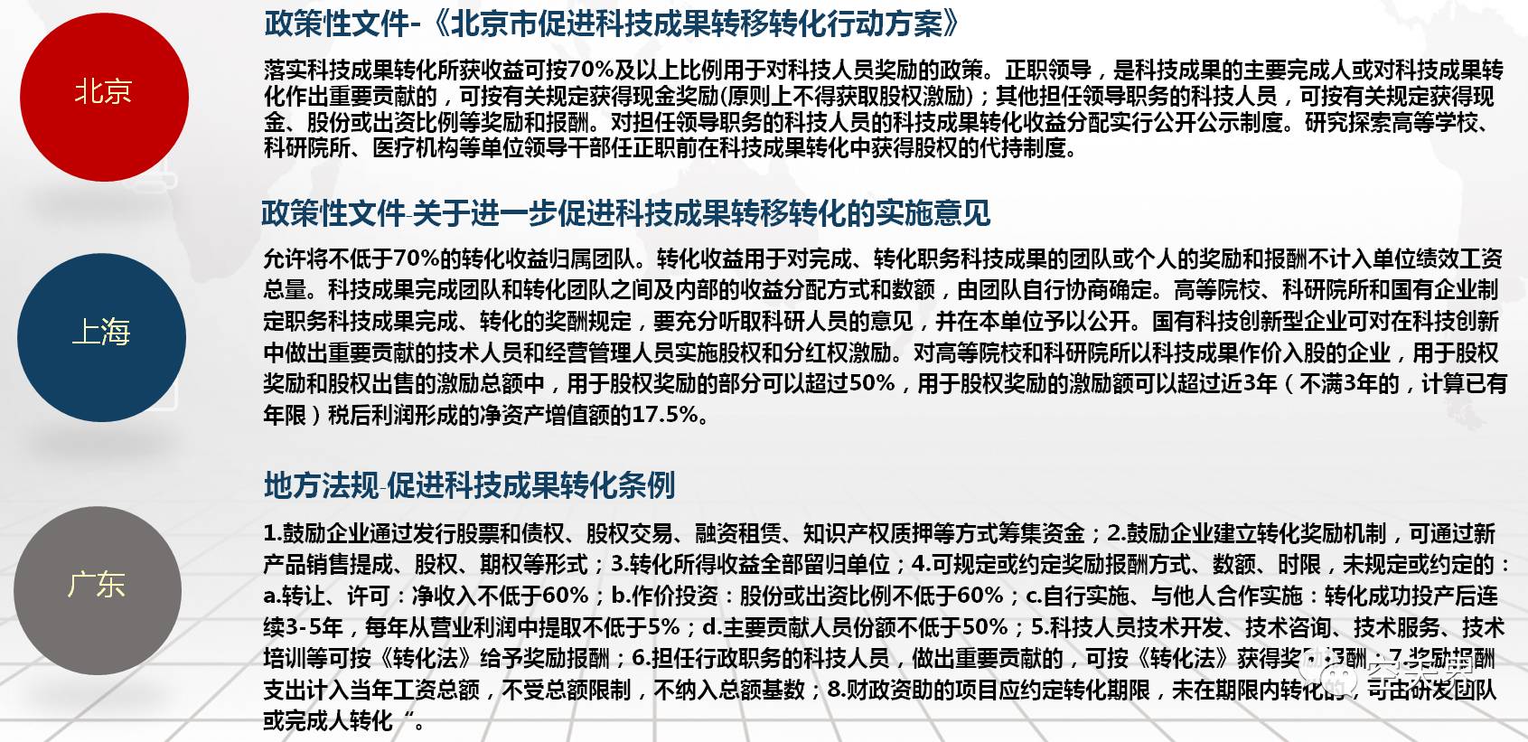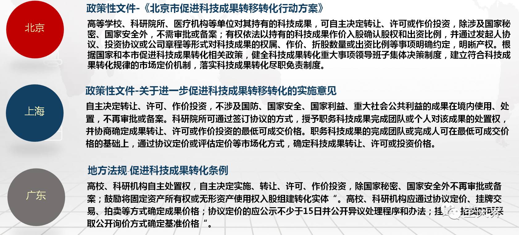因为决定了科技成果的处分问题。这是一个根本性问题,我选择了北上广三个经济最发达的地区,也是科技创业最活跃的三个地区相关政策,跟大家一起解读一下。