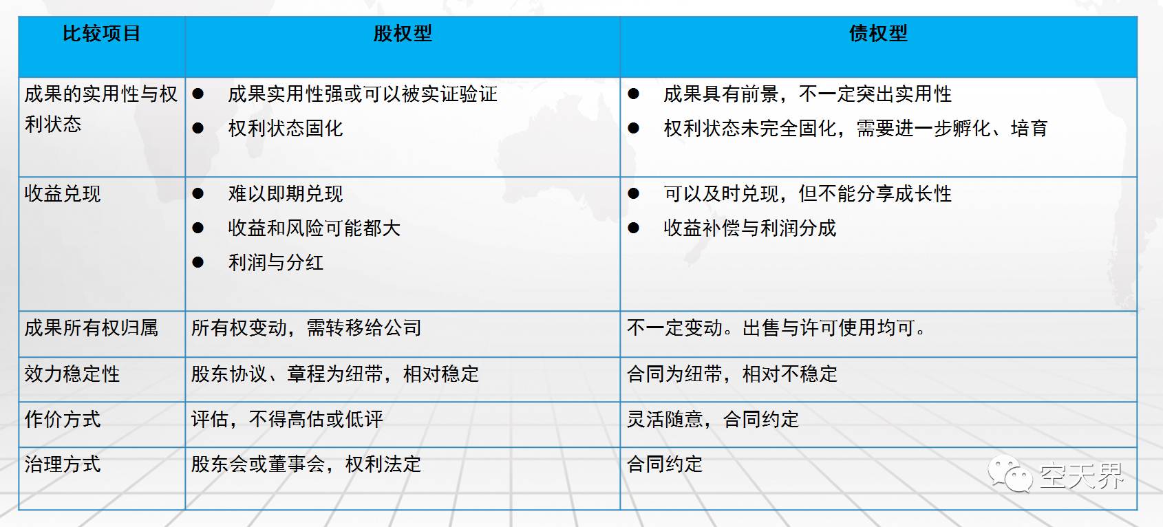 第三,股权转化模式取得的收益,本质上是一种附带条件的权利。比如说持股的方式,收益与风险成正比,但是法律关系比较复杂。大家知道一项成果从取得到慢慢孵化到投产需要漫长的时间,漫长时间意味着法律的复杂。而债权模式,本质上是一种限时权利。至于债权的支付条件是一次性付款还是分期付款是不参与公司的治理,因此他的权利收益与风险的关联度比较低,法律关系也相对比较简单。这就是债权型的。