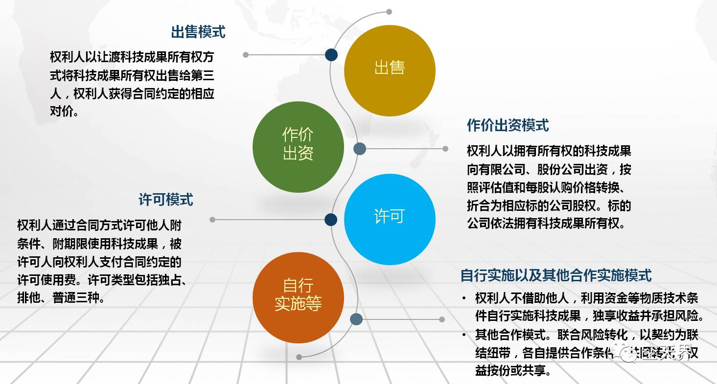 做转化,要知道科技成果表现形式,一般说是专利申请权,更多是商业秘密,通称为专有技术。对于这样的知识产权,转化方式无非就是四种:一出售。二作价出资;三许可使用;四自行实施。