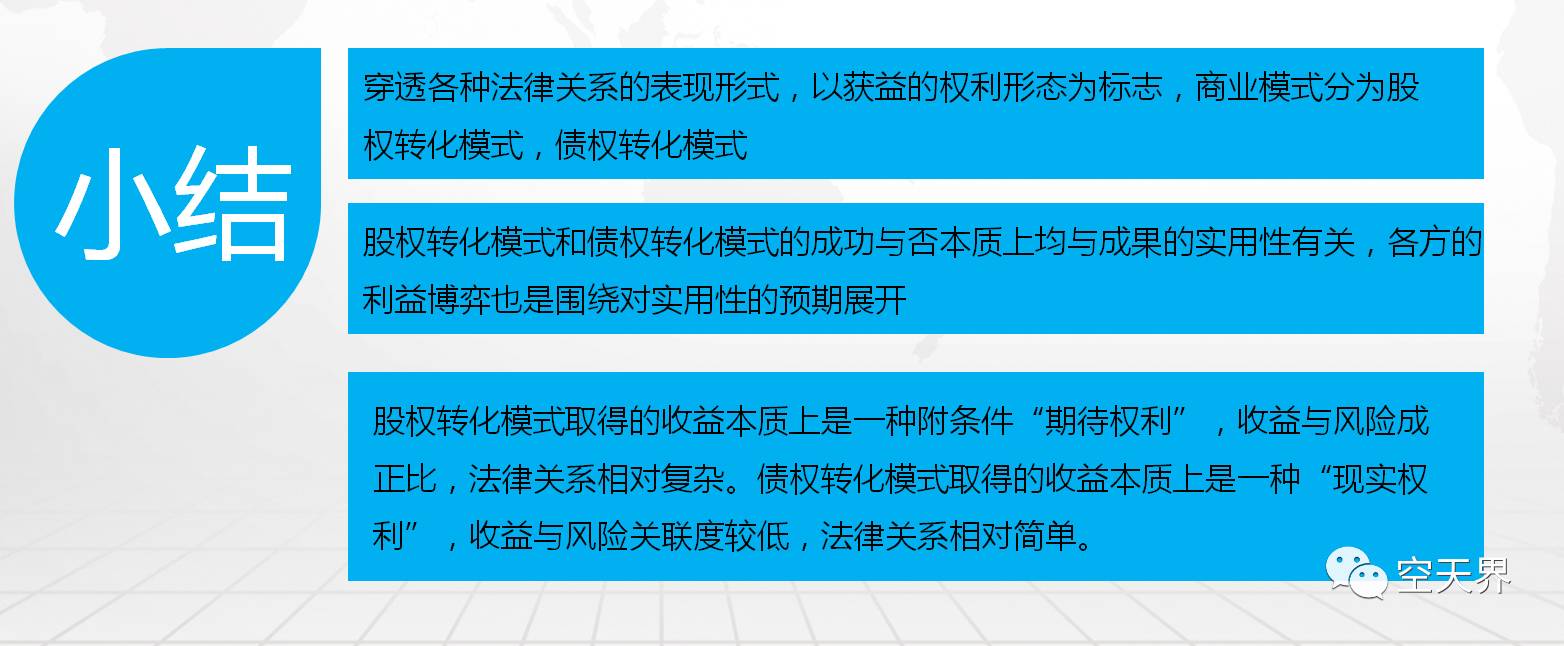 通过转化方式的本质,其实我归结了一下就两类:第一,股权式。第二,债权式。可以通过以下六个方面做一些分析、比较。