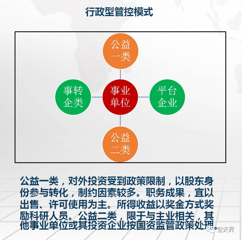 过去历史上很多事业单位投资办了企业,因此事业单位的投资企业也放在里面来讲,是属于行政性的方式。在公益一类里面对外投资受到限制,不可能,约束较多。这种情况下职务成果,比如说一类企业有类似的东西卖掉,不用分享股权,高价、低价不是主要的问题。