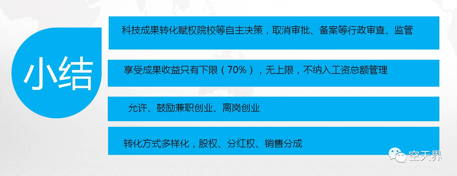 第一,科技成果转化赋权院校自主决策。这是重要性,取消了审批备案的行政审查和监管。因为过去的监管体制有上报、批准,尤其有备案,虽然不是行政批准,但是有备案,这样的话其实在中国的政策和土壤环境下,备案代替了实际上行使行政审批。以后是按照高校按照内部程序进行决策,不再接受向上级监管公司的批准备案程序。