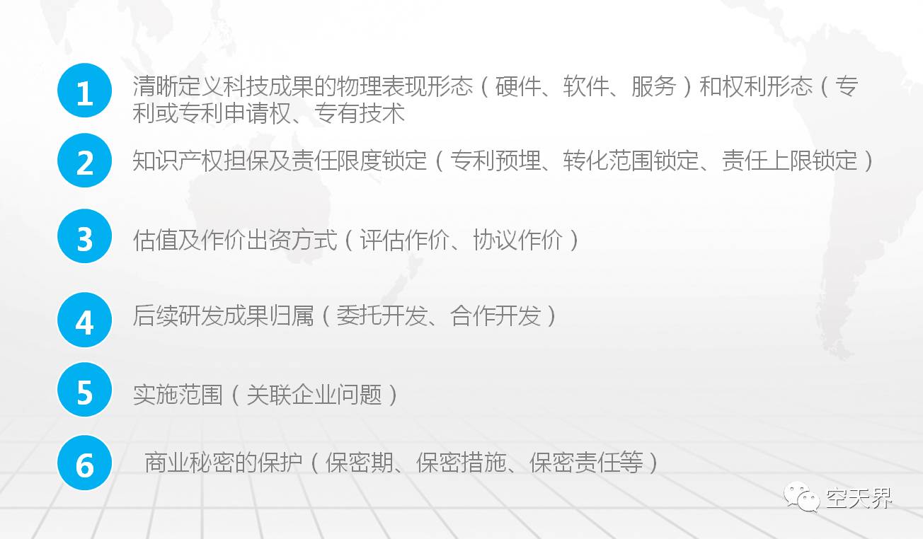 第五,实施范围。主要是指许可使用,以及卖了以后实施范围问题。因为现在的商事主体不是单一的企业,投了企业之后大量是通过关联企业做的,这产生了一个问题,知识产权保密问题。比如说你将你的知识成果投入到A公司,A公司作为实施主体。A公司下面有A、B、C、D若干个生产线,B、C、D受不受到约束,这需要考虑的。如果不限定,允许A公司的关联方都来实施专利技术、知识产权的话,很有可能是泄密,也不利于权利人最后权益的兑现。大家可以遇到具体问题的时候,根据A公司的实际情况作判断。如果说限制,限制几家,如果不限制,范围有多大,或者承担多大的保密责任。这需要在相应的协议里面做提前的安排。