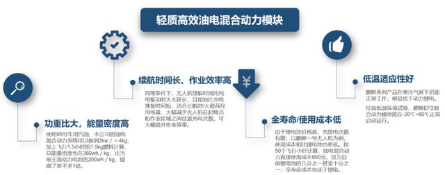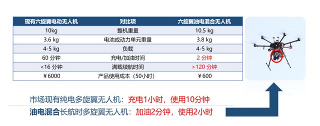 混合动力无人机产品在市场中最突出的竞争力是混动系统瞄准痛点,便捷用户;飞行平台稳定可靠,久经验证;系统集成服务驱动,应用导向;简单概括讲,那就是瞄准特定行业,以特有混动系统为基础,选择特别飞行平台,为用户提供高可靠性,高操作便捷性,高作业效率的无人机服务平台。