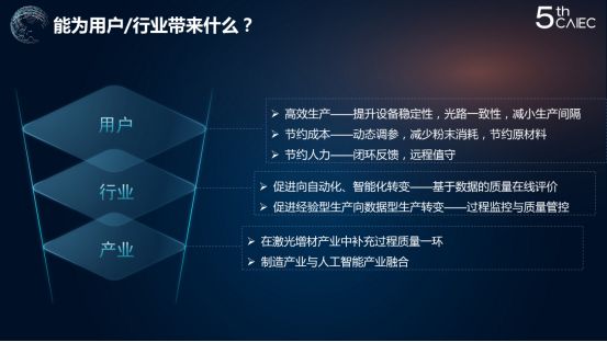 我期待就是团队能够将来在增材产业、增材制造的行业里面真正留下自己的名字。我们一直在说现在做的是监控,但是将来肯定做的是智联管控的平台,未来我们希望把现在的系统变得更大,变成数据库平台,为行业提供服务,完成自己的历史使命。